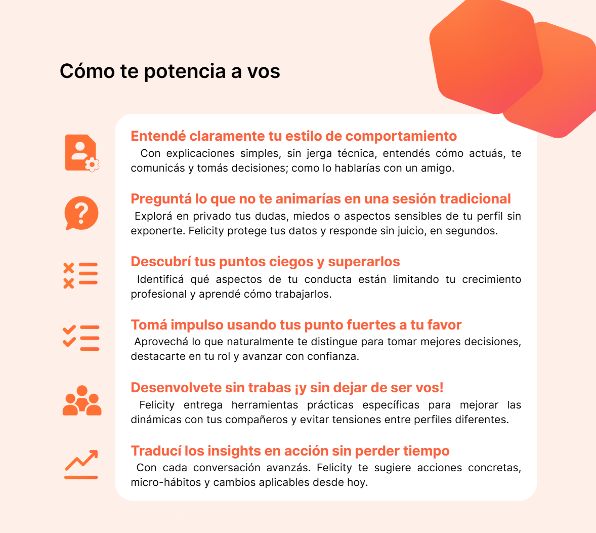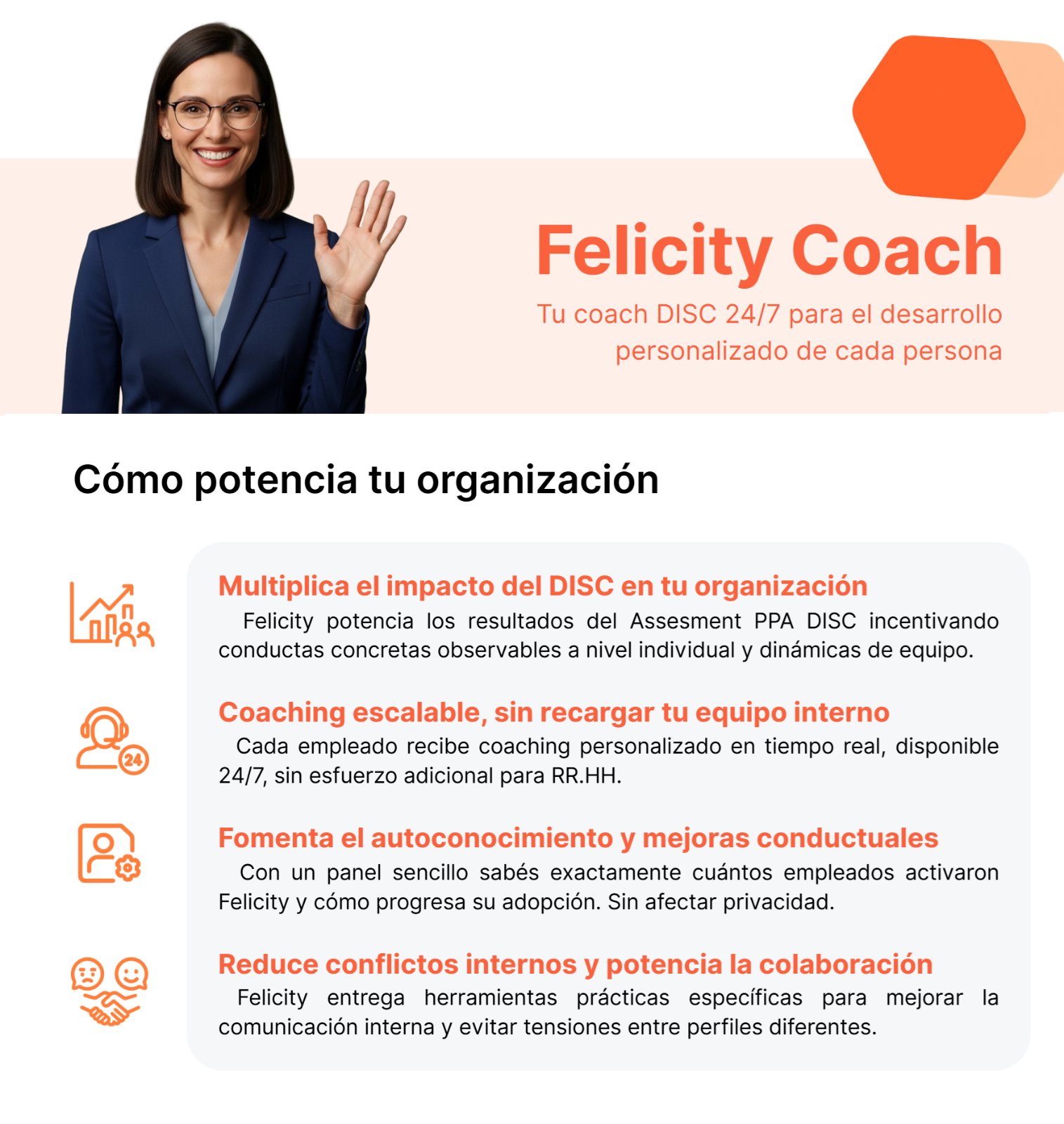✔ Acceso a Felicity, tu coach de IA por 3 meses, que interpreta tu perfil DISC y te guía con recomendaciones personalizadas para tu desarrollo y liderazgo diario.